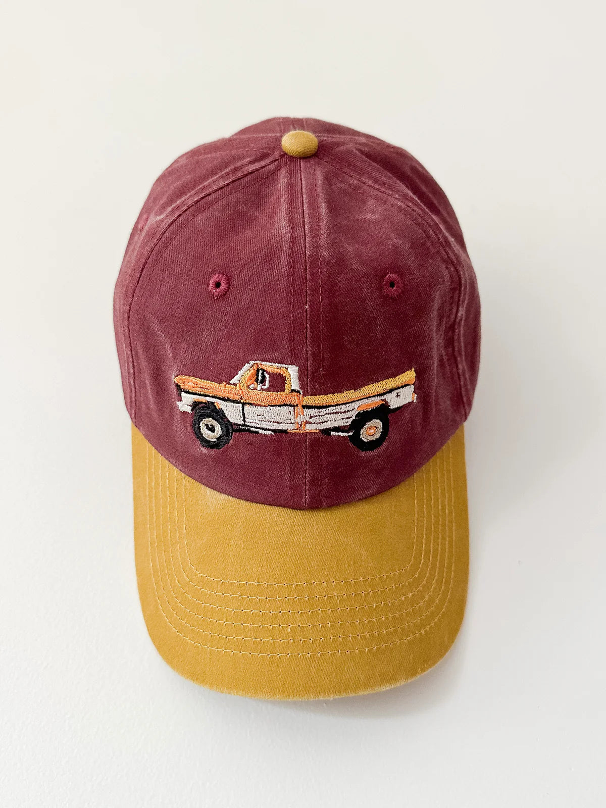 Hand painted truck design embroidered on vintage wash crimson cap with adjustable brass look strap, featuring contrast mustard wash brim.