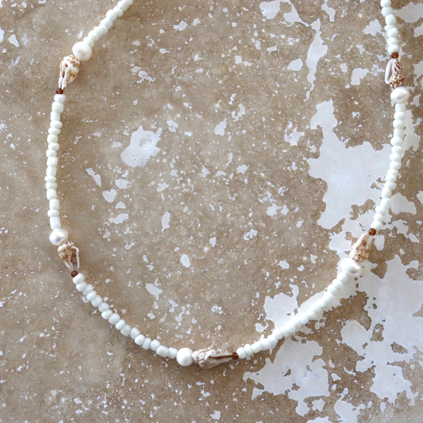 Bangalow - Shanty - Coastal Collection Spring Summer - solid salt colour 3mm glass seed beads, with pearls, shells and tiny tan cut crystals. Ultimate weekend/vacation piece for all the sunny days