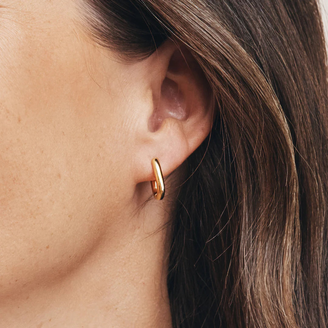Elevate your everyday style with these sleek oval shaped gold huggie hoops. Simple, stylish, and timeless, they are the perfect for stacking or wear alone for a more minimal look.