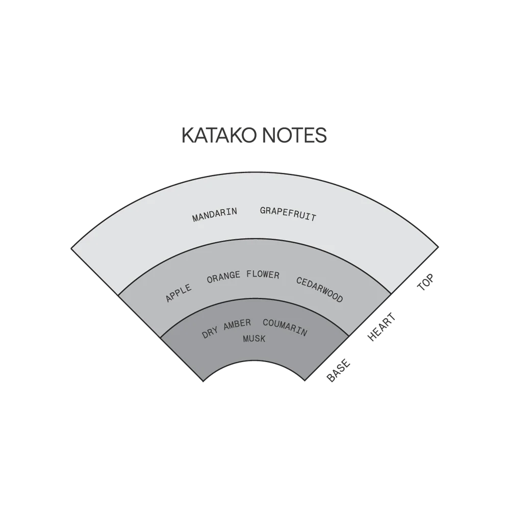 Refined and radiant, Katako blends the inviting layers of musk, amber and coumarin with a bright, modern twist of grapefruit, mandarin, armoise and cedarwood. Katako is effortless modernity. Sophisticated, dynamic and unmistakably commanding.