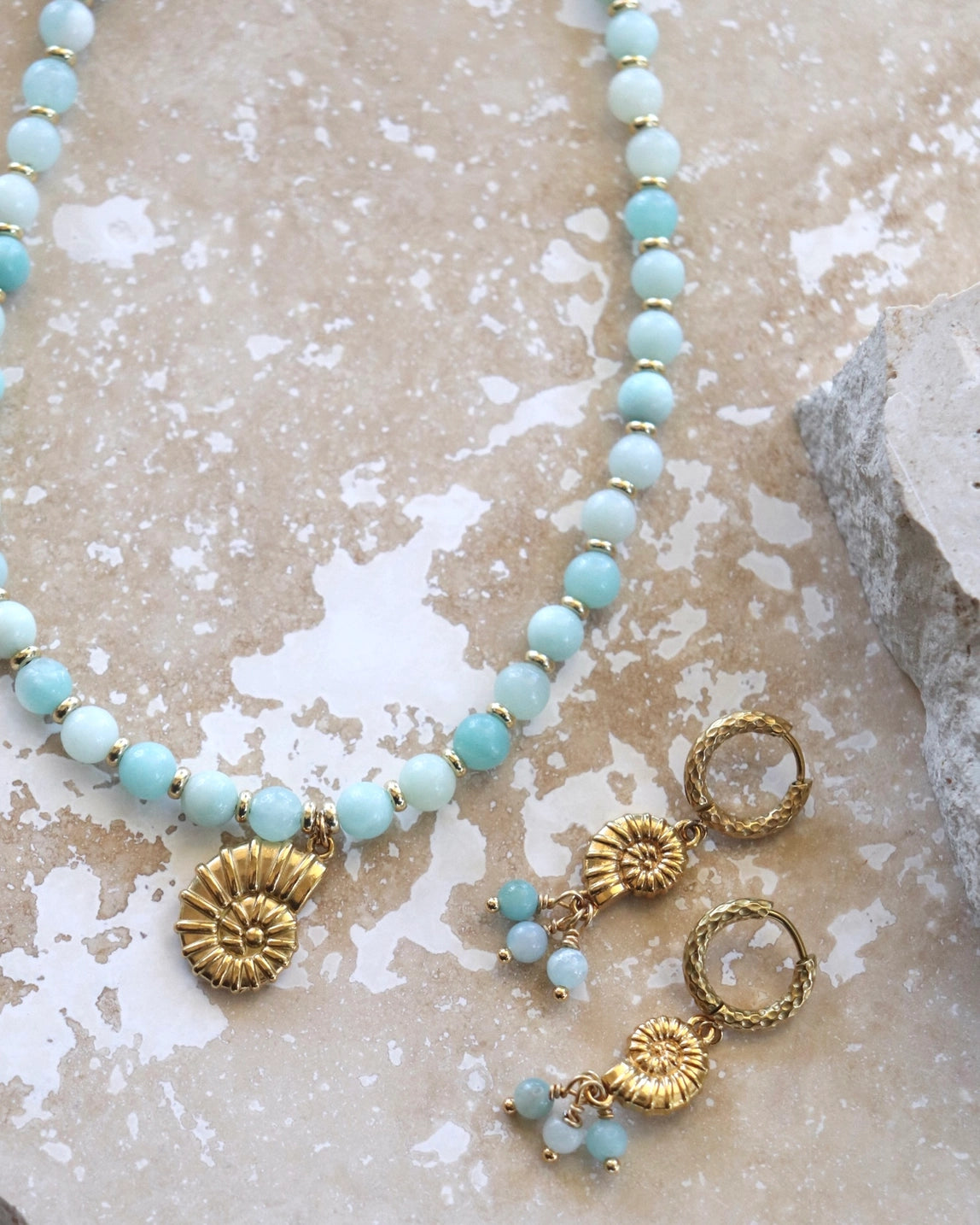An approach to what's hot in the world of semi-precious stone jewellery and fashion is to gather all the stones into one strand of beads and stainless steel spacers, together with a statement oversized brilliant shell charm, to bring you an elevated look that you can take on holidays (or feel great while you’re packing lunch boxes).