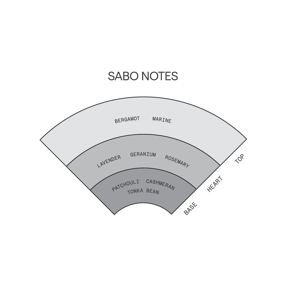 Fresh, clean and lively, Sabo radiates energy. Cashmeran, patchouli and tonka bean ground the fragrance with an earthy warmth, while bergamot, rosemary and geranium cut through with vivid intensity. Sabo is pure vitality. Instantly wearable, with a vibrant edge and uplifting clarity.