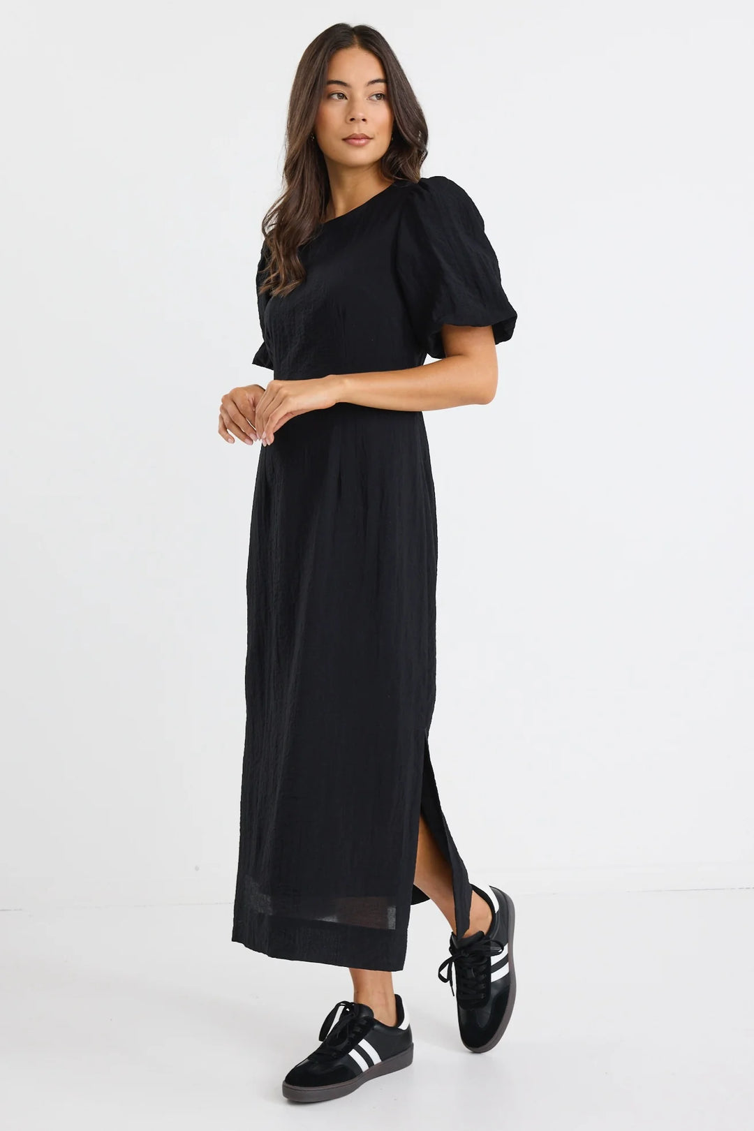 Elder Black Short Puff Sleeve Tie Midi Dress