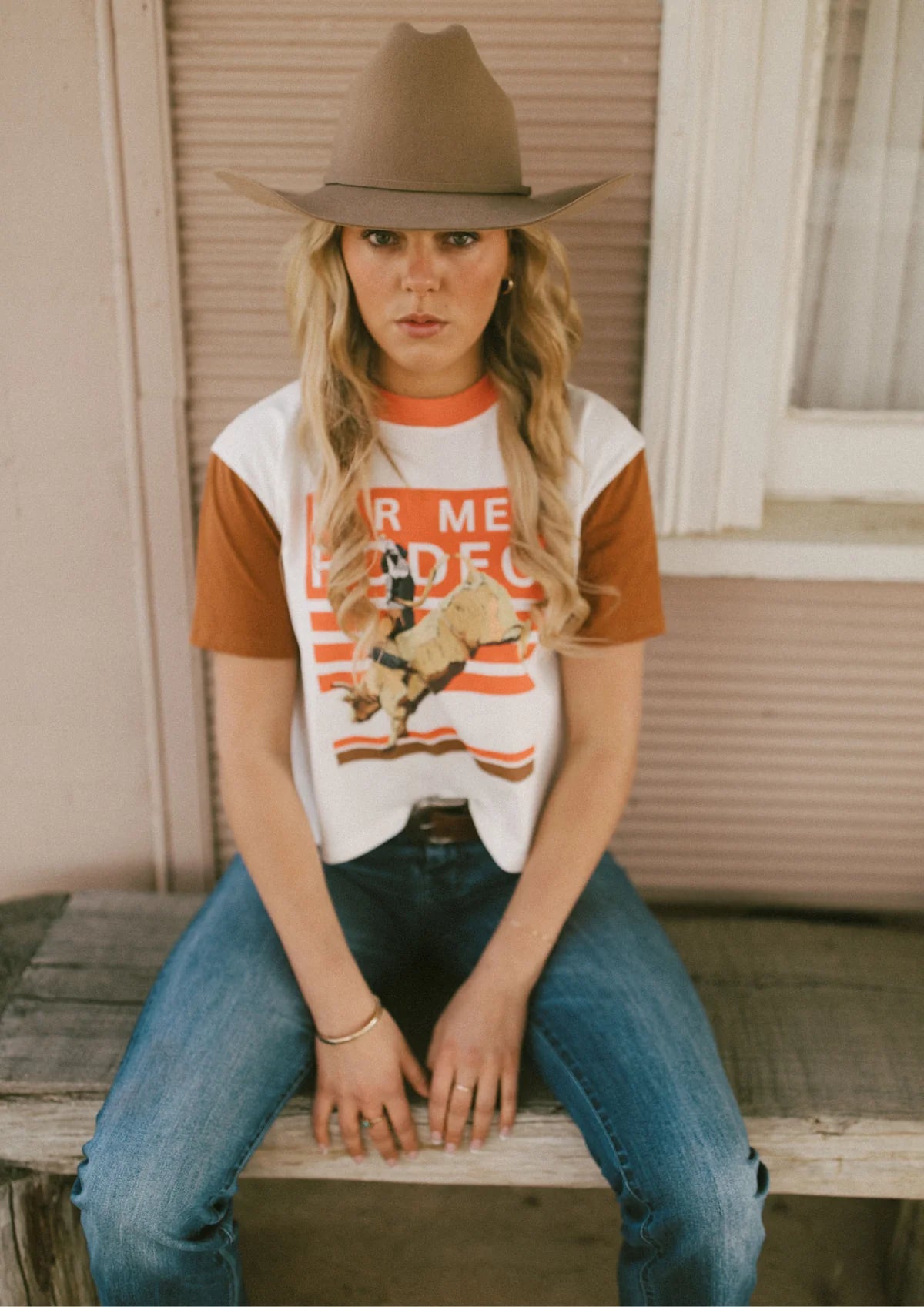 The FM Rodeo Short Cut Crew is a salute to rodeo bravado and dusty rebellion. Cut from heavyweight 230gsm cotton, it’s built to feel solid and lived‑in. The crisp‑white body is framed by burnt‑orange contrast sleeves and orange neck ribbing — a colourway reminiscent of arena dust and long Western roads. The bold chest graphic — inspired by vintage rodeo posters — hits like a bull out the gate: fast, loud, and unapologetically Western.